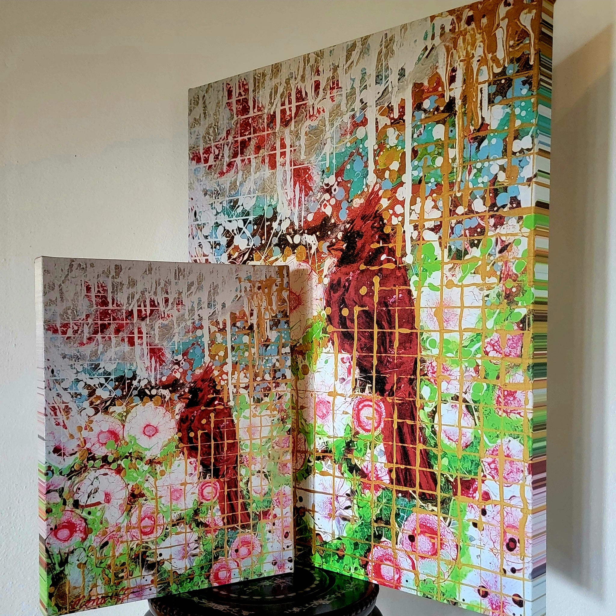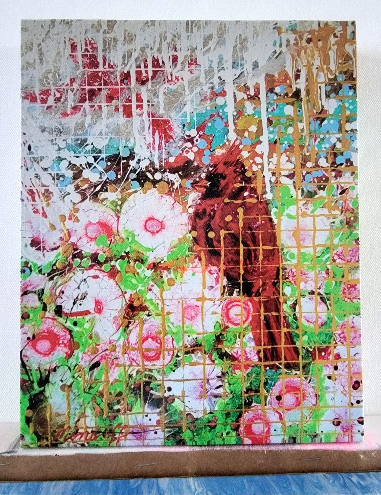 The cardinal—long cherished as a heavenly messenger—rises from the colors of this world and ascends toward the light of the next. Surrounded by soft drips and blooming textures that echo life’s beauty and fragility, it symbolizes the sacred moment we release this earthly place and rise into God’s embrace.